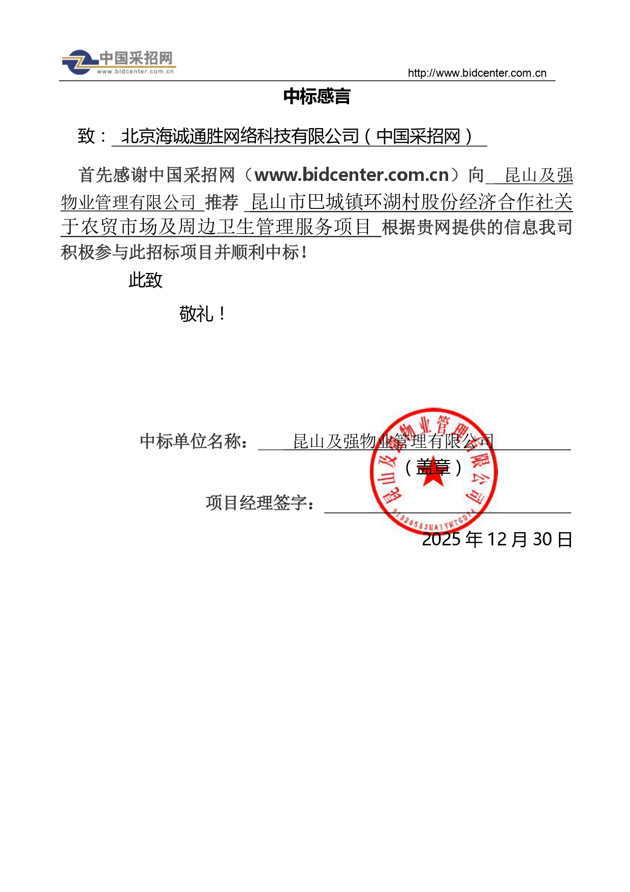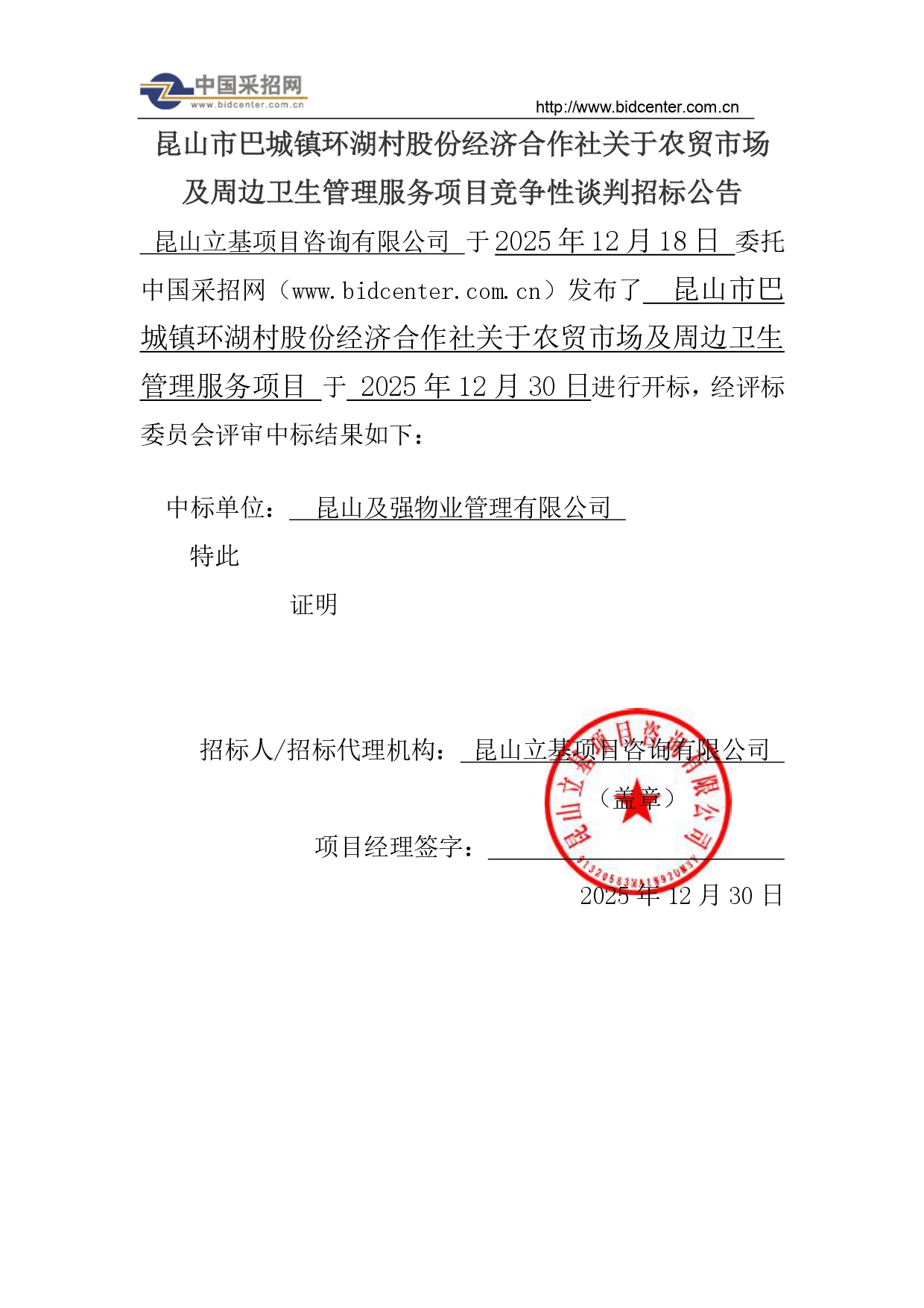 中标项目: 昆山市巴城镇环湖村股份经济合作社关于农贸市场及周边卫生管理服务中标公告